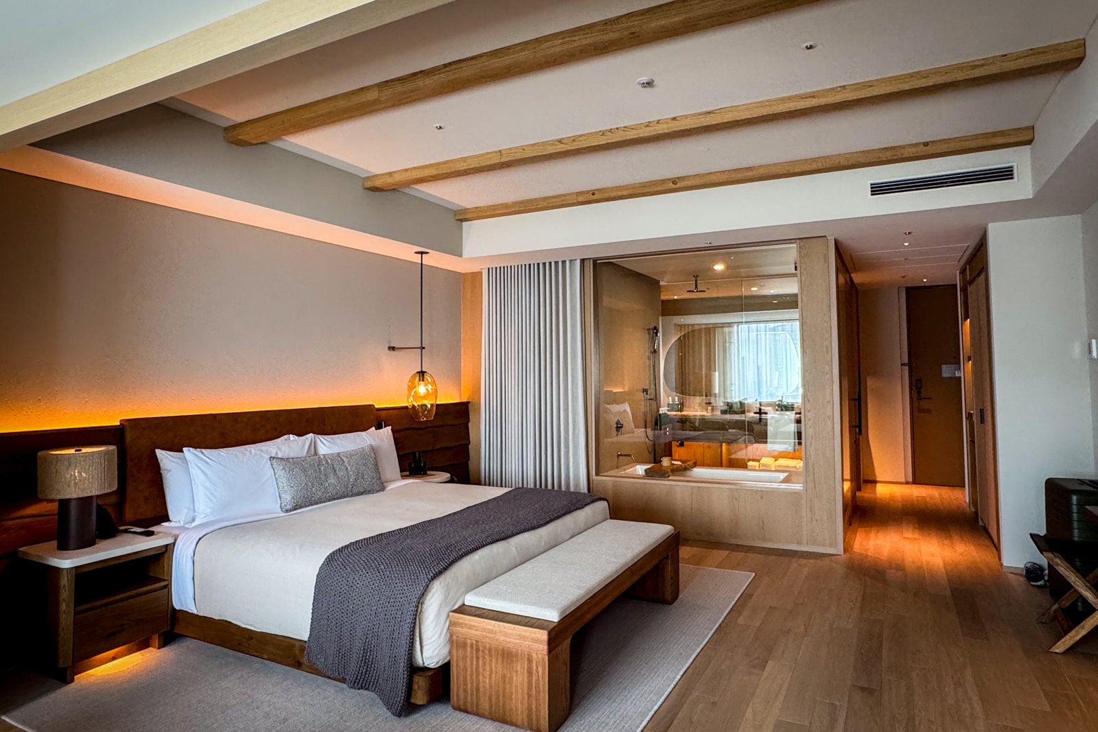 Glassed-in bath-shower suites feel like your own individual onsen experience and come stocked with Bamford amenities plus my favorite cheeky touch: a little hourglass in the shower, should you feel the need to limit your water usage by trying to soap up and rinse off before the sands run out.