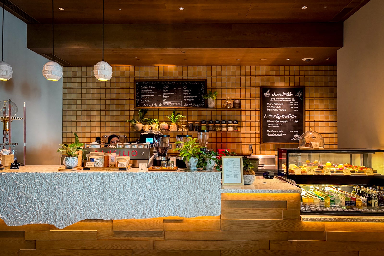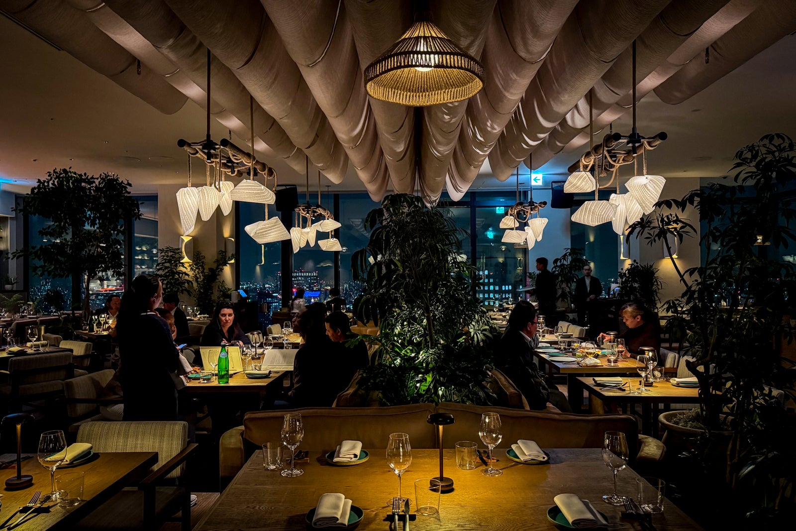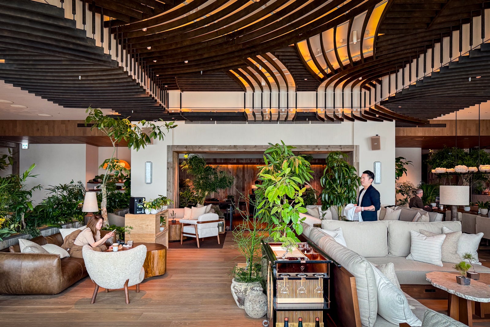 Lush greenery abounds, the wooden ceiling beams evoke both the rake patterns of Japanese sand gardens and the roofs of local temples, while expansive white-cushioned sectionals and welcoming seating vignettes with fluffy chairs and leather sofas all look out toward Tokyo Tower and the city’s skyline.