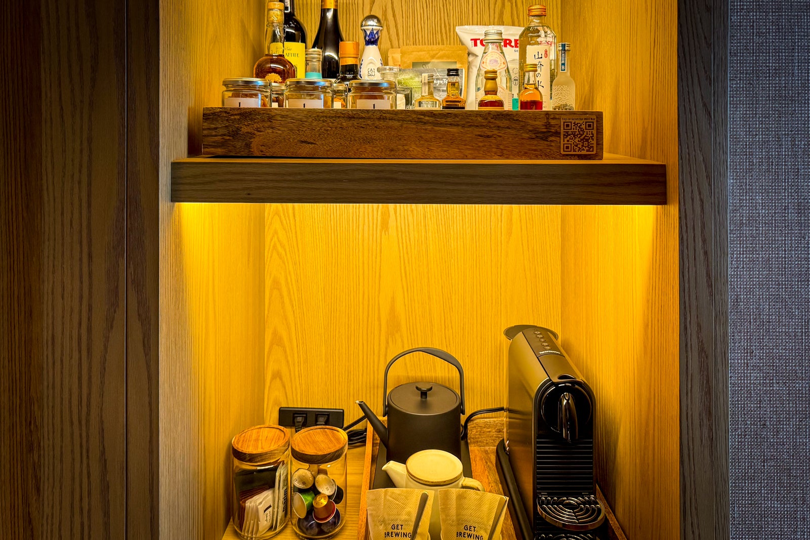 But this 1 Hotel also feels distinctly Japanese, with design elements that reference traditional ryokan, or inns, such as live-edge shiplap bed backs that call to mind traditional rural Japanese houses, woven carpets reminiscent of tatami mats and wavy wall art resembling handmade fish traps.
