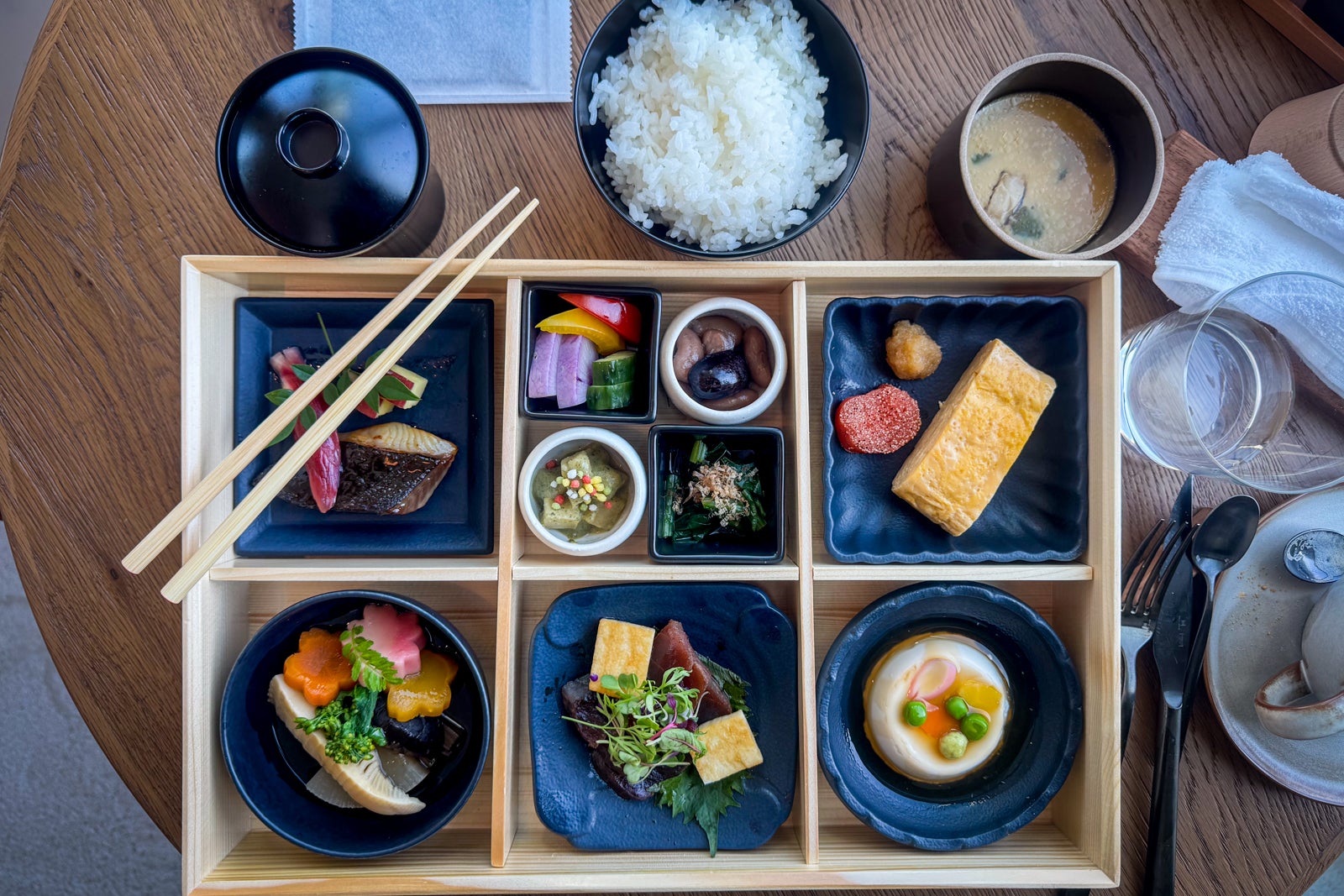 Breakfast, which is also served here, includes a buffet of fruits, pastries and cold cuts accompanied by main dishes like a mushroom tartine with Comte cheese and fried egg, French toast with roasted mikan orange and maple syrup, kitsune udon with an onsen egg, and a profuse Japanese breakfast bento box with a variety of delicacies including maguro tuna sashimi and a traditional rolled omelet (menu for $50 per person with a $10 supplement for the Japanese bento box).
