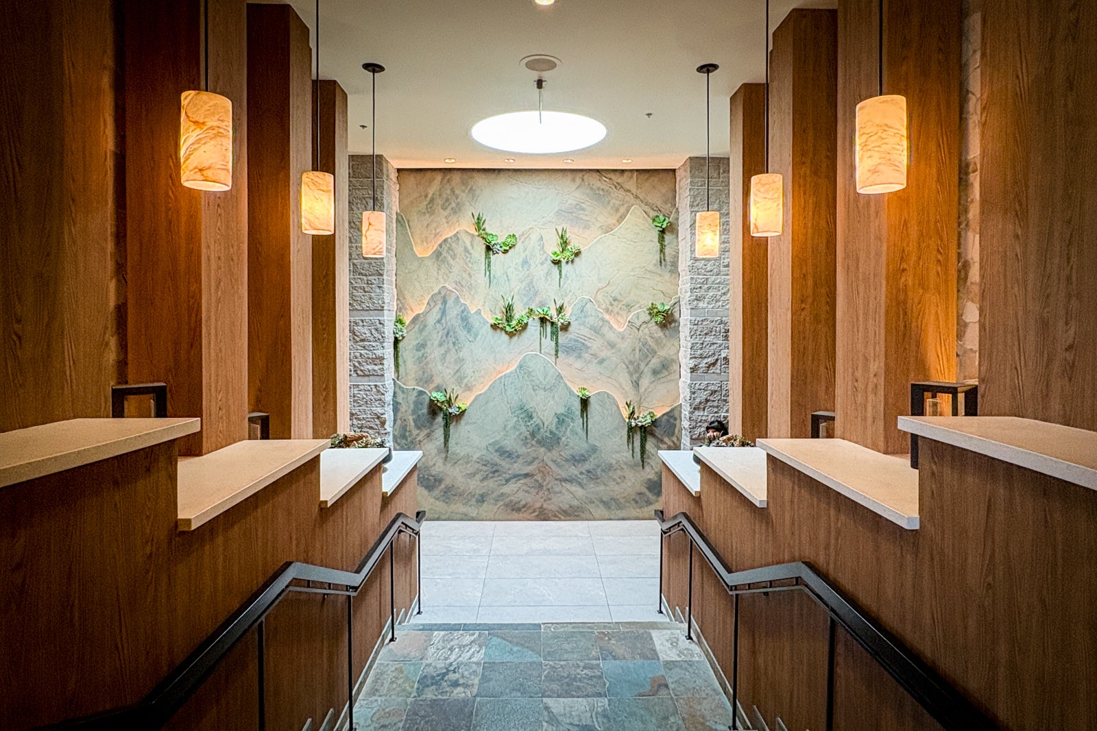 From the moment you’re greeted and descend the staircase, the spa sets a calming tone. The serene space includes 19 treatment rooms, men’s and women’s locker rooms, relaxation lounges, a full salon and a 24-hour fitness center with Peloton bikes and plenty of strength equipment.