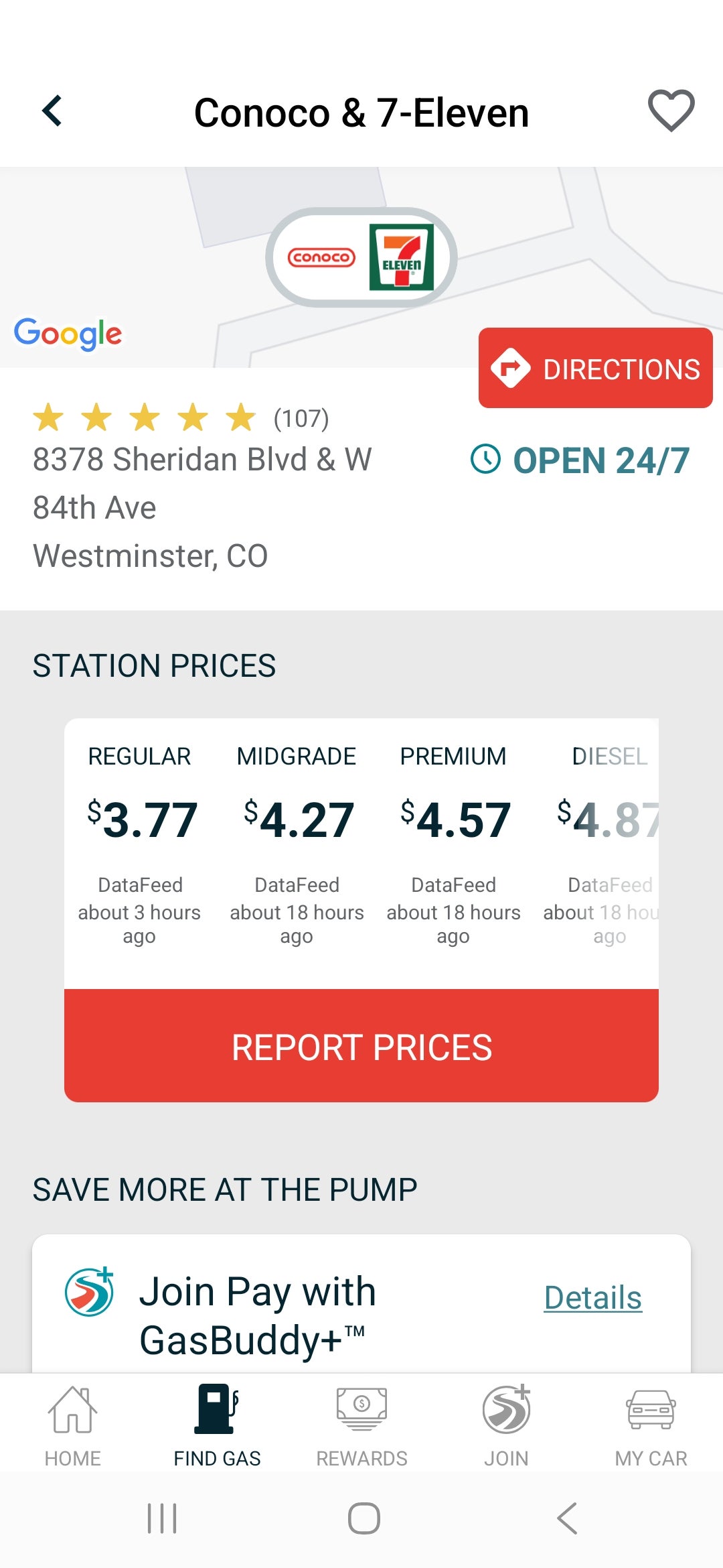 Tap on a gas station to see its pricing for each type of gas. GasBuddy relies on crowdsourcing for pricing data, so prices may not always be accurate. However, we’ve found that most stations are updated at least once per day; you can see the last update time below the price.