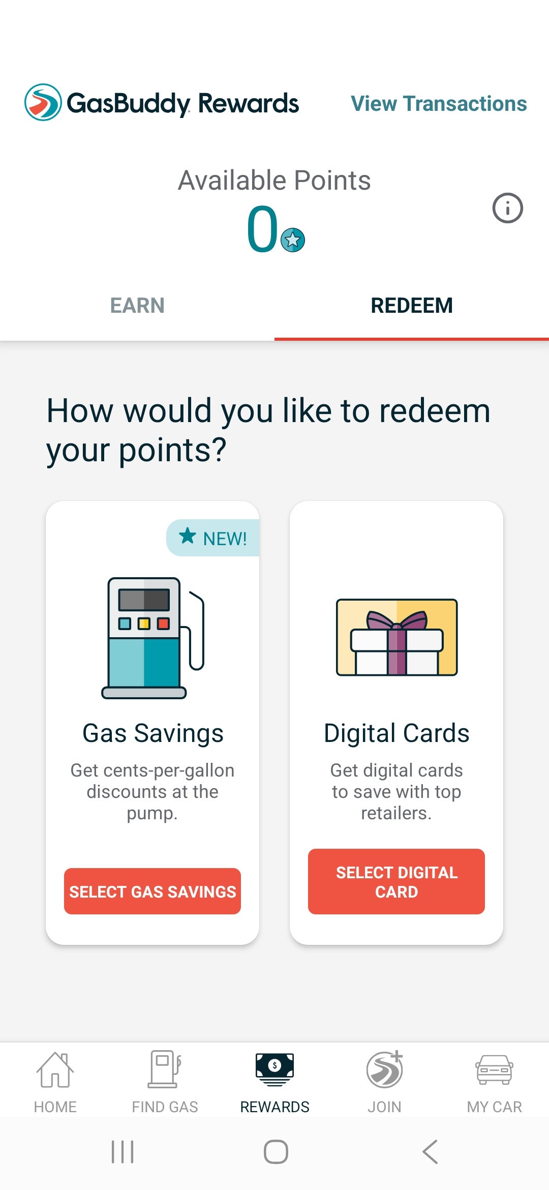 You can redeem points for digital gift cards or, if you have a Pay with GasBuddy+ membership, redeem them toward additional savings on gas. Two thousand points equate to 10 cents off per gallon, and the savings will automatically apply to your next fill-up.