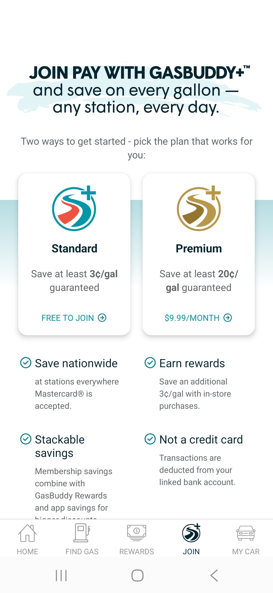 There are two types of membership. The Standard plan is free to join and guarantees savings of at least 3 cents per gallon, though you may save up to 25 cents per gallon depending on where you fill up. You can save even more with a Premium plan — more on that in a moment.