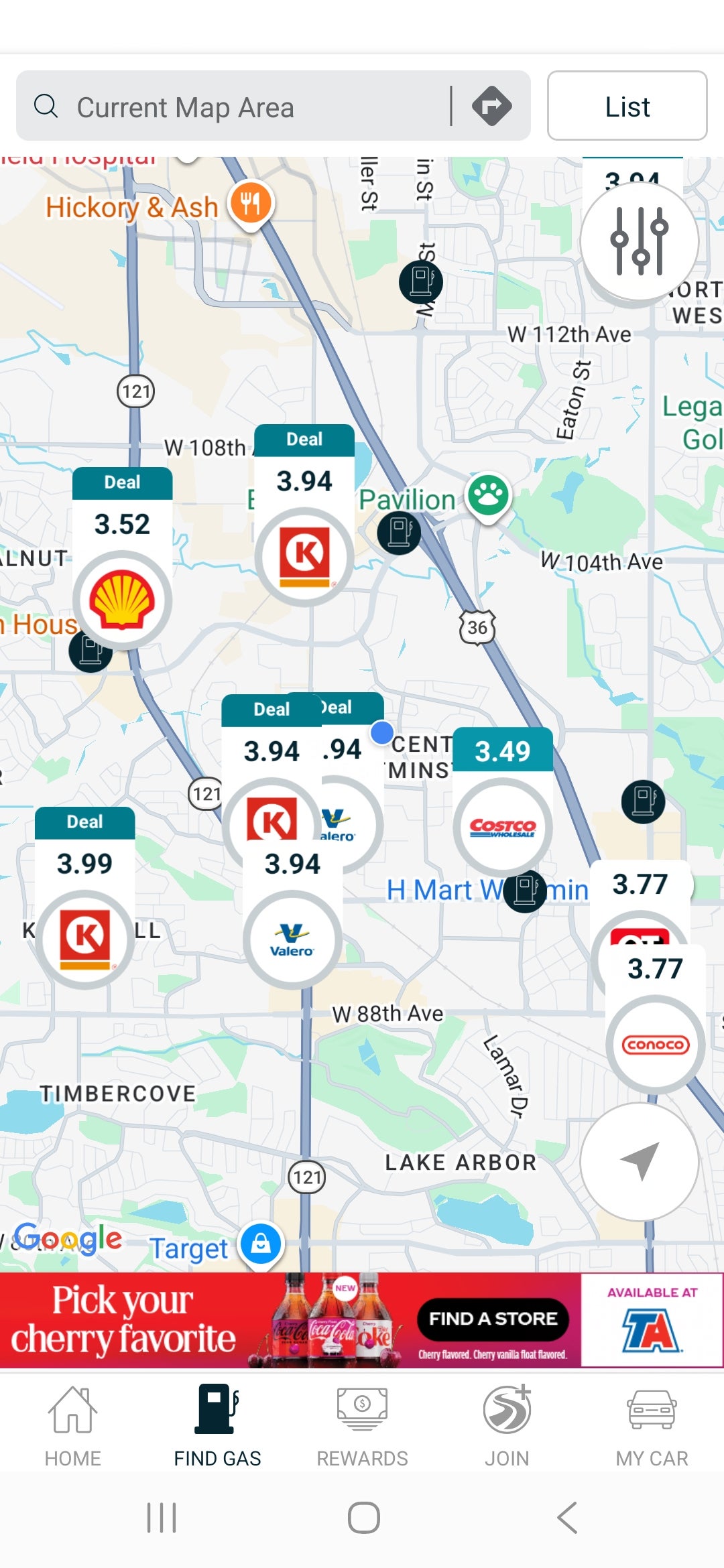 The GasBuddy app shows prices at all stations nearby to help you find the best deal on gas. Just download the mobile app and let it see your current location. You can filter by which fuel type you’d like to buy and how far you’re willing to drive for gas.