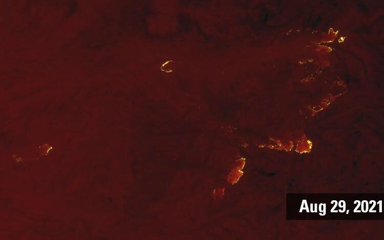 Landsat 8’s thermal infrared, shortwave infrared and near infrared spectral bands expose the Caldor Fire’s advancing edge south of Lake Tahoe in California in a nighttime image from August 29, 2021.