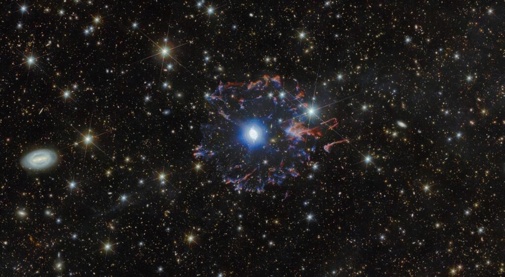 This time, Hubble is joined by ESA’s Euclid space telescope to create a new image of NGC 6543. The combined eyes of Hubble and Euclid reveal the remarkable complexity of stellar death in this object. Though primarily designed to map the distant universe, Euclid captures the Cat’s Eye Nebula as part of its deep imaging surveys. In Euclid’s wide, near-infrared, and visible light view, the arcs and filaments of the nebula’s bright central region are situated within a halo of colorful fragments of gas zooming away from the star. This ring was ejected from the star at an earlier stage, before the main nebula at the center formed. The whole nebula stands out against a backdrop teeming with distant galaxies, demonstrating how local astrophysical beauty and the farthest reaches of the cosmos can be seen together with Euclid.
